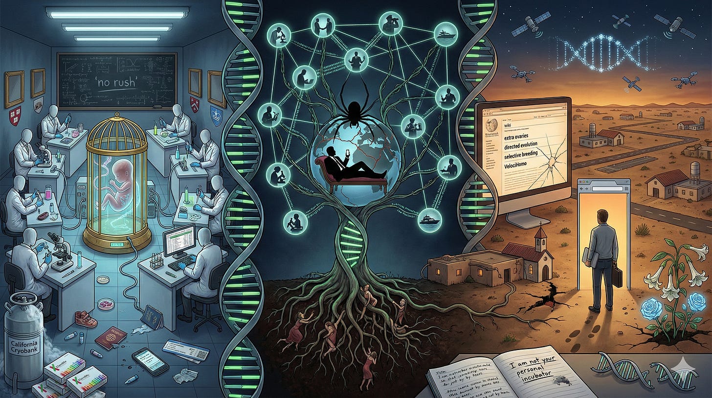 As técnicas avançaram exponencialmente desde 2019. A gametogênese in vitro progride em múltiplos laboratórios ao redor do mundo. O CRISPR ficou mais preciso, mais barato e mais acessível. O gene drive pode alterar espécies inteiras em poucas gerações. A optogenética controla neurônios individuais com luz. He Jiankui saiu da prisão e abriu novo laboratório em Pequim. Bryan Bishop é hoje diretor de tecnologia de um banco — e mantém online, em diyhpl.us, não apenas o FAQ de designer babies e o catálogo de 6.863 modificações genéticas, mas um ecossistema inteiro de pesquisa habilitadora: instruções para criar ovários supranumerários (arquivo), uma proposta de seleção dirigida de famílias humanas para inteligência (arquivo), enciclopédias de técnicas de edição genética (arquivo) e métodos de delivery de terapia genética (arquivo), um programa de longevidade que vai de senolíticos a transplante de corpo inteiro (arquivo), um framework de reparo de dano genômico para alcançar “senescência negligenciável” (arquivo) e um manifesto transhumanista cujo “Princípio Proacionário” sustenta que as restrições à tecnologia é que devem se justificar, não o contrário (arquivo). O projeto não está num rancho isolado nem num laboratório ultramarino. Está na internet aberta, expandido, esperando o próximo financiador — e vai muito além do FAQ de designer babies. O mesmo wiki hospeda uma página dedicada a ovários supranumerários (arquivo), com instruções detalhadas, passo a passo, sobre como criar ovários extras em mamíferos: induzir um segundo genital ridge, travar identidade ovariana, capturar células germinativas primordiais via quimiotaxia CXCL12-CXCR4, fornecer contexto ductal e escalar o nicho somático. A motivação implícita é brutal: mais ovários significam mais óvulos, mais embriões para selecionar, mais matéria-prima para o projeto VelociHomo. Outra página, “directed evolution” (arquivo), propõe abertamente um “long-term human family selective breeding project for cognitive traits” — seleção dirigida de famílias humanas para inteligência, memória, longevidade e ciclos de sono reduzidos. É o programa Zorro Ranch traduzido para linguagem técnica, com referências a artigos científicos. Uma terceira página sobre longevidade (arquivo) cataloga intervenções de senolíticos a terapia genética e transplante de corpo inteiro, conectando-se diretamente à rede Thiel-Nygard-Victor que o dossiê documenta. E a página sobre transhumanismo (arquivo) articula a filosofia que sustenta tudo isso: o “Princípio Proacionário”, segundo o qual o ônus da prova recai não sobre quem desenvolve tecnologia potencialmente perigosa, mas sobre quem pretende restringi-la. É a base ideológica do “total deniability” proposto a Epstein: inovação sem limites regulatórios, ciência sem comitês de ética, engenharia genética humana como exercício de liberdade individual. Wolfe fundou a Metabiota, que depois foi absorvida pela Ginkgo Bioworks. E em algum lugar, talvez num freezer de universidade prestigiosa, as peças do quebra-cabeça de Epstein aguardam alguém com dinheiro, ambição e a mesma indiferença moral do seu criador original.
