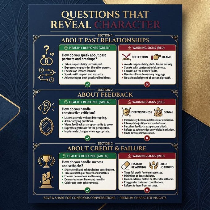 Sobre crédito e fracasso: “Me conte sobre seu maior fracasso profissional. O que aconteceu?” Pessoas saudáveis assumem seus fracassos. Narcisistas reescrevem a história. “Quando um projeto tem sucesso, como você distribui o crédito?” “Descreva uma vez em que estava errado sobre algo importante.”
