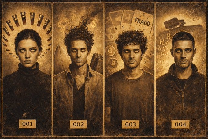 Sam Bankman.Fried construiu a FTX até uma avaliação de 32 bilhões de dólares enquanto conduzia o que promotores chamaram de “uma das maiores fraudes financeiras da história americana”. Análise linguística mostrou que “SBF tende a manipular e enganar outros de maneiras que apresentam a aparência de preocupação empática... seu uso implícito da linguagem sugere falta de empatia e propensão ao desengajamento social.” Seu colega, Gary Wang, testemunhou ter ajudado a Alameda Research a se apropriar indevidamente de até 65 bilhões de dólares de clientes da FTX. Bankman-Fried cultivou uma persona de “altruísmo eficaz”. Cabelo desalinhado, camisetas, aparente humildade. Enquanto privadamente cometia fraude eletrônica, fraude de valores mobiliários e lavagem de dinheiro. Agora cumpre 25 anos.