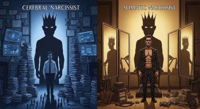 Vaknin distingue entre narcisistas cerebrais (que buscam suprimento através da superioridade intelectual e frequentemente demonstram pouco interesse em assuntos físicos) e narcisistas somáticos (que ostentam aparência física, conquistas sexuais e posses materiais). Ambos os tipos podem alternar durante o colapso. Um somático fracassado pode se tornar cerebral. Um cerebral desafiado pode se tornar encoberto, depois maligno.