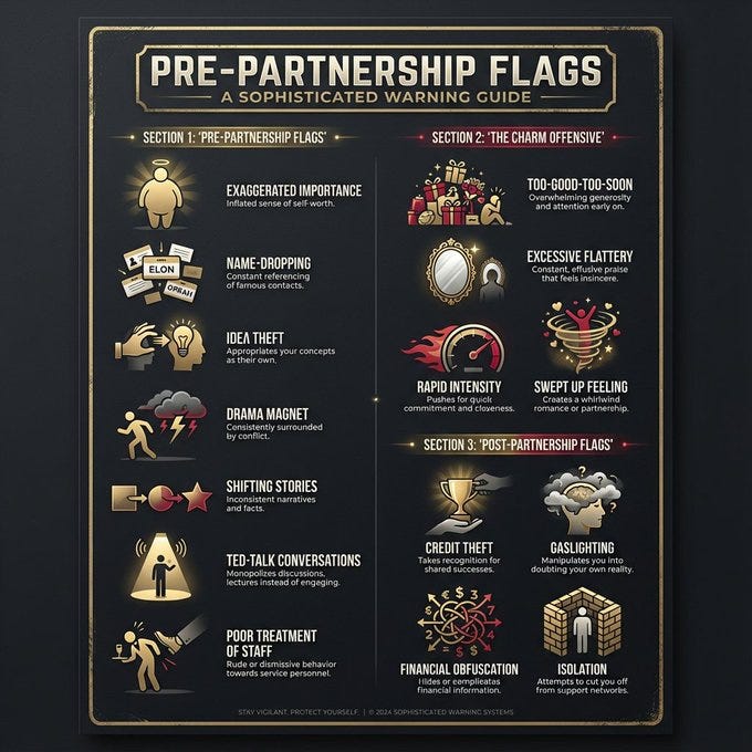 Sinais de alerta comportamentais pré-parceria incluem: auto.importância exagerada, constante name.dropping, descartar as ideias dos outros apenas para apresentá.las depois como suas, drama sempre os cercando (”rompendo com pessoas, cambaleando de uma crise emocional para outra”), histórias e números que mudam entre conversas, controlar conversas como palestras TED em vez de diálogos, e tratar mal funcionários de serviço.
